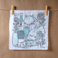 This handkerchief art has been lovingly designed and screen printed by Claire Manning. The hankie is a 100% cotton and sized approximately 12 inches by 12 inches with a delicate scalloped edging. It is printed with eco friendly, water based ink in grey and aqua.
