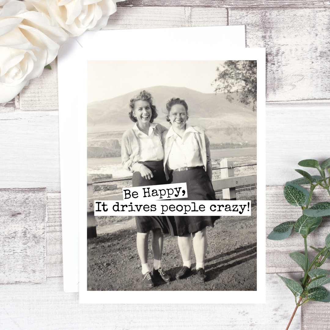 Cultivate joy and make others mad with envy - show off your good vibes with "Be Happy, It Drives People Crazy!" Guaranteed to put a smile on your face and a frown on those around you!